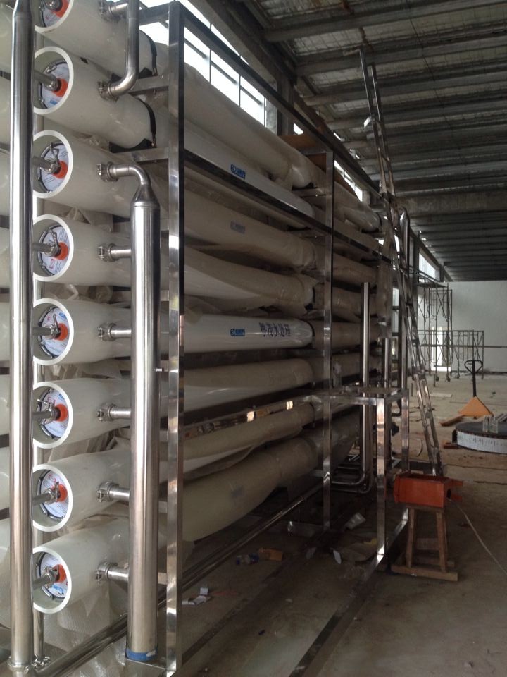 系統各個連接到位后,進入調試階段。把原水泵,高壓泵,備用的旋鈕開關打到OFF位置,把砂濾碳濾上的手動多路閥打到正洗反洗狀態,把高壓泵前的系統低壓保護開關用螺絲刀調至常閉,(這步需懂電路人士調)開進水,開電源,確定有水后開一下原水泵立即關閉,立即查看水泵的轉向是不是同泵體上的箭頭方向一致,如相反請調相正轉,高壓泵也如此調試,(此調試針對380V的系統)220V的系統無需調相調試,方向調好后進入下一步調試,把原水泵開關打開把砂濾上的多路閥打到正洗,即多路閥中間位置,反洗在多路閥右邊。運行在多路閥左邊,利用正洗反洗把石英砂洗干凈為止(排水口水清即可)然后把多路閥打到運行,進行碳濾清洗,碳濾清洗也如同砂濾清洗,洗干凈為止,再打開濃水閥(即濃水流量計進后的不銹鋼球閥,把進膜總壓力閥(即高壓泵出水位置的不銹鋼球閥關二分之一,再開高壓泵清洗膜,此時濃水流量計應沖到頂部位置,待排水口水清(剛開始膜的清洗排水位乳白色)排水口水清之后進行水質調節,慢慢關濃水閥此時面板上的膜前壓力后膜后壓力隨之慢升高,注意濃水閥切勿關死,500L調至純水流量到9L/分鐘的位置,(250L系統調至5L/分鐘,1000L系統調至20L/分鐘)此時水質偵測的電導率會慢慢下降直至穩定,就是系統最佳產水水質,注意:膜前壓力和膜后壓力一般調到8KG左右,最高不要超過10KG,系統正常調節為濃水和純水是1:1,根據客戶的需求也可適當把濃水調小,但禁止全關閉,膜前壓力和膜后壓力由上述的兩個不銹鋼球閥控制,客戶可自行嘗試 ,但要注意壓力控制10KG以內,電導率的讀數一般在20us-cm以內,但要根據當地的水源來定,水源好電導率就低。系統壓力,產水,水質穩定后就是最佳運行狀態,此時可以設點高壓泵前低壓保護,壓力一般設置在1KG,低于則自動控制就會報警停機,系統每次開機和連續運行2小時都會自行沖洗90s,沖洗時沖洗電池閥打開水全部排走,無純水產出。膜前壓力和膜后壓力只有1GK以內的壓力。90S過后沖洗電磁閥回自行關閉此時壓力和流量都會達到之前的最佳工作狀態。沖洗時不要盲目操作其他開關和閥門。自動控制內還提供原水箱低水位報警和純水箱高水位報警供客戶自行連接,請參考自動控制器說明書,關機先關電在關水,開機先開水在開電。