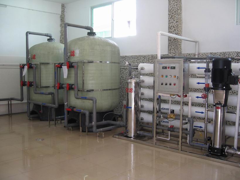 原水增壓泵+石英砂過濾器+活性碳過濾器+鈉離子軟化器+保安過濾器+高壓泵+RO膜+紫外線殺菌(臭氧殺菌)+膜濾器+成品水箱適應水質(zhì):自來水,地下水,苦咸水