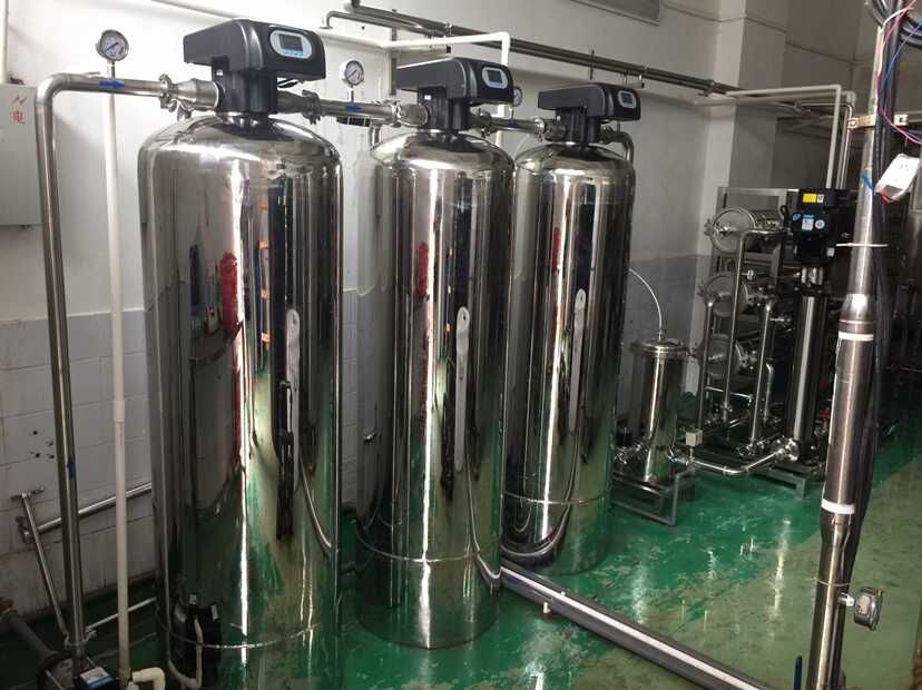 水處理系統(tǒng)先將原水送入機(jī)械過濾器的預(yù)處理系統(tǒng),然后進(jìn)入活性炭過濾器,然后通過加阻垢劑裝置投加阻垢劑,使預(yù)處理產(chǎn)水滿足反滲透進(jìn)水要求,并且防止?jié)馑赗O膜的一側(cè)結(jié)垢,再進(jìn)反滲透除去鹽分使產(chǎn)水水質(zhì)滿足設(shè)計要求。
