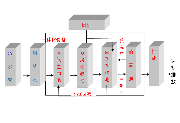 本一體化污水處理設(shè)備。工藝描述如下:接自污水管網(wǎng)的污水經(jīng)過調(diào)節(jié)池均質(zhì)、均量后,通過提升泵輸送到一體化污水處理平臺。一體化處理平臺經(jīng)過厭氧、好氧及MBR膜+消毒后,然后達(dá)標(biāo)排放。工藝流程圖如下: