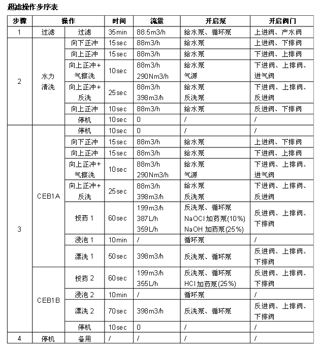6. 化學(xué)加強(qiáng)反洗(CEB)周期: 超濾 CEB 分為 CEB1A(堿+次氯酸鈉洗)和 CEB1B(酸洗)。 CEB 周期:1 次/20 次過(guò)濾(可以根據(jù)情況修改,CEB 效果良好,可提高過(guò)濾次數(shù);CEB 效果不 佳,可降低過(guò)濾次數(shù)至 15 次)。