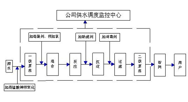 首先要選好合適的水源水和取水口,輸送至一級泵房(取水泵房)并在一級泵房前加高錳酸鉀以殺滅藻類、植物和貝類動物。再通過一級泵房加壓,將水送至廠內處理系統中。在進入凈水構筑物之前,通常經過混合(在水源水中加入適量的硫酸鋁,俗稱礬)反應、沉淀、過濾、消毒等處理工藝,每一工藝配以相應的構筑物(如沉淀池、濾池、清水池等),濾后消毒一般是加氯,投加了消毒劑的水經清水池、并在池內反應一小時左右就成為合格的飲用水,再經過二級泵房(輸水泵房)加壓輸送到城市管網中,供生活飲用和生產使用。