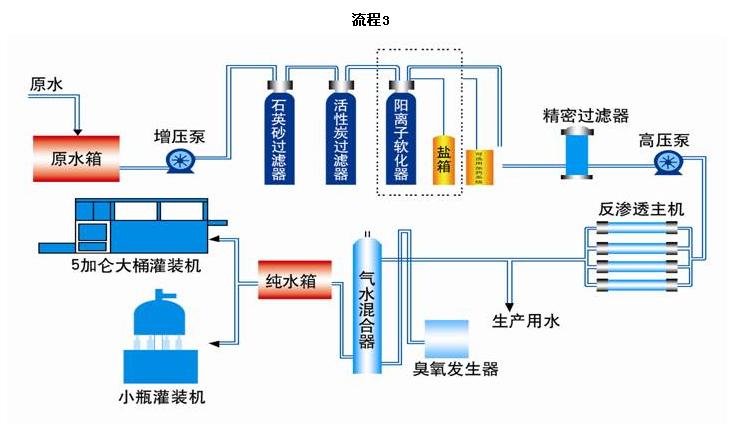 原水→原水箱→原水泵→多介質(zhì)過(guò)濾器(石英砂過(guò)濾器)→活性炭過(guò)濾器→軟水處理器→精密過(guò)濾器→高壓泵→一級(jí)反滲透(RO)裝置→純凈水箱→高壓泵→二級(jí)反滲透→紫外線裝置→用水點(diǎn)